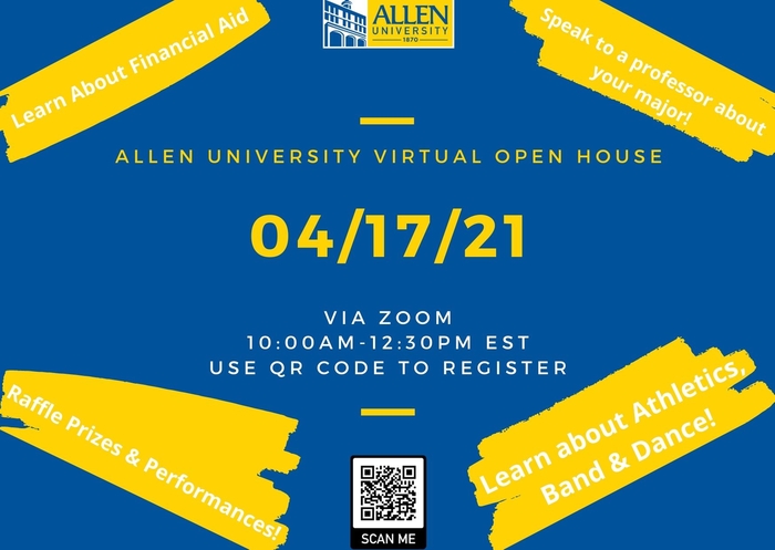 Allen University will host a virtual open house event on Saturday, April 17, 2021 from 10AM - 12:30PM EST via Zoom. The event is open to the public but you will need to register as space is limited. Learn about financial aid; speak to a professional about your major; learn about athletics, band, and dance; participate in raffle prizes; hear from Allen University's President, VP of Student Affairs, and VP of Academic Affairs; and enjoy special performances from the Allen University band, dancers, mascot, and Greek organizations.